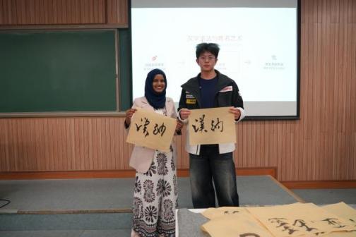 活动中,“击鼓传花”破冰环节率先点燃气氛,话筒传递间,手持者用英语自我介绍,快速拉近彼此距离。核心环节“沉浸式文化探索工作坊”中,多个特色文化站点开放,各小组依次体验,沉浸式感受两国文化魅力。汉字书法站点里,崔明润、刘健琨、隋金昊三名同学耐心讲解汉字笔画美学与“福”、“友”等字的美好寓意,为毛里求斯嘉宾定制中文名字并指导书写;中国茶艺体验站点内,吴俊毅同学细致演示绿茶、乌龙茶冲泡技艺,分享茶道精神,毛里求斯嘉宾驻足观色、闻香、品茗,还热情交流当地红茶文化;毛里求斯文化专区更是热闹非凡,嘉宾分享地理历史民俗知识,带领大家跳起传统Sega舞,将现场气氛推向高潮。此外,彭子函、陈力扬同学的民族舞蹈与笛子独奏,尽显中华传统文化韵味,获嘉宾一致好评。